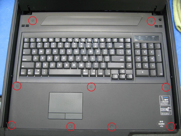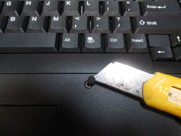 Step 1: Take out the black dot (9pcs in red circle as shown below) in order to access the screws on keyboard cover by using cutter.