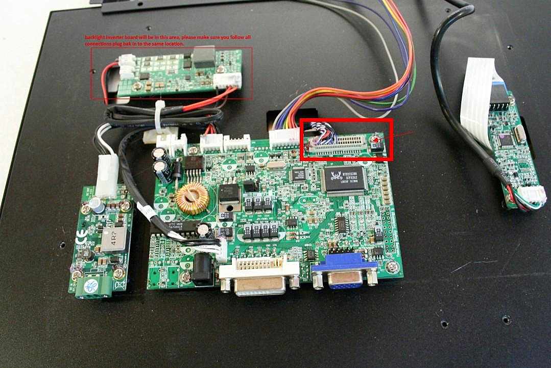 Problem: Once power is applied we receive a screen with multi-color bars across the screen and then it goes blank. Solution: The issue cause by connection loosen. After reconnect, the monitors work normally. See below picture for reference:
